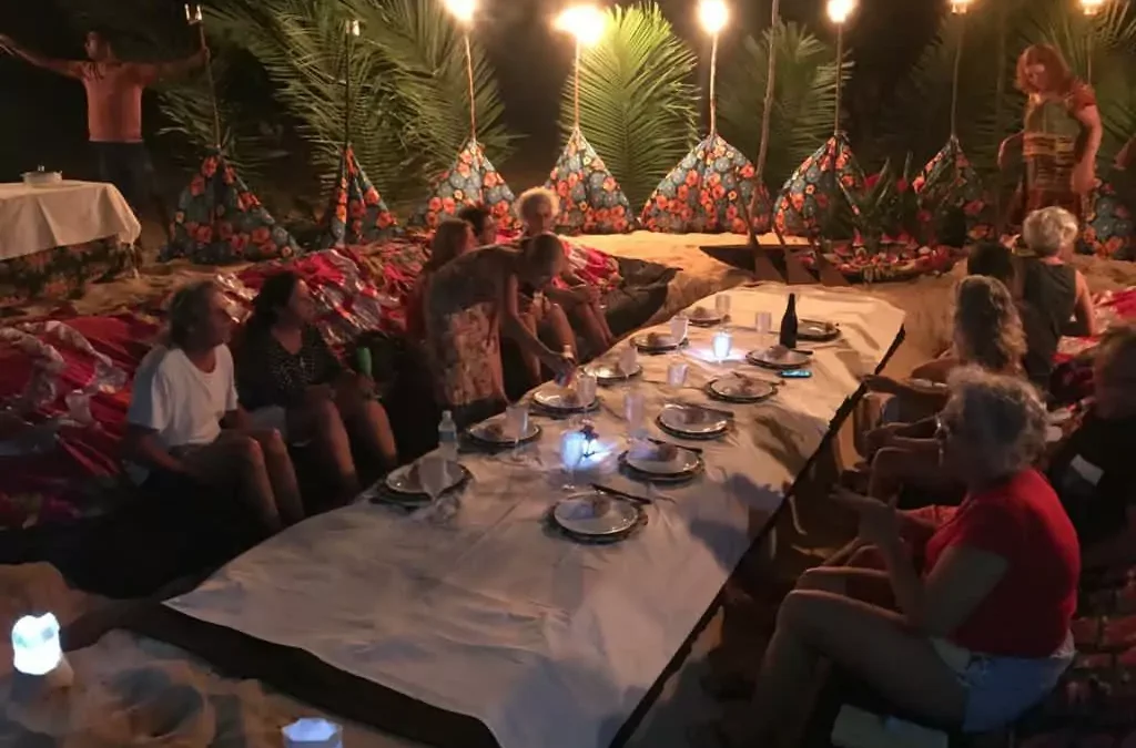 Montado na areia e sob a luz do luar apenas para você, sua família ou amigos que viajaram junto a você, o cenário é composto por artesanatos locais, mesas baixas e tochas que iluminam ao redor. Na fogueira, o peixe é assado e combinado, depois, com caipirinhas e sucos de frutas da região. No silêncio da cidade ribeirinha, o som da música regional ecoa durante o jantar e combina-se com as rodas de conversa entre você e seus companheiros de viagem. Não há nada mais característico dali que o Carimbó, ritmo que mistura as influências indígenas, portuguesas e africanas. As canções se estendem noite afora e fazem qualquer viajante tenha vontade de alegrar ainda mais o corpo na dança.