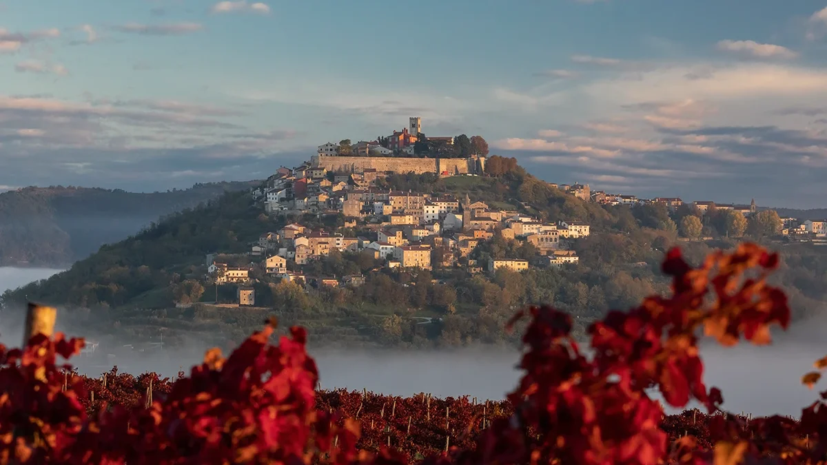 Motovun, talvez a fortaleza medieval mais bem preservada da região, guarda muralhas dos séculos XIII e XIV e uma vista que parece não ter fim — vinhedos, florestas de trufas e o vale do Mirna serpenteando lá embaixo.