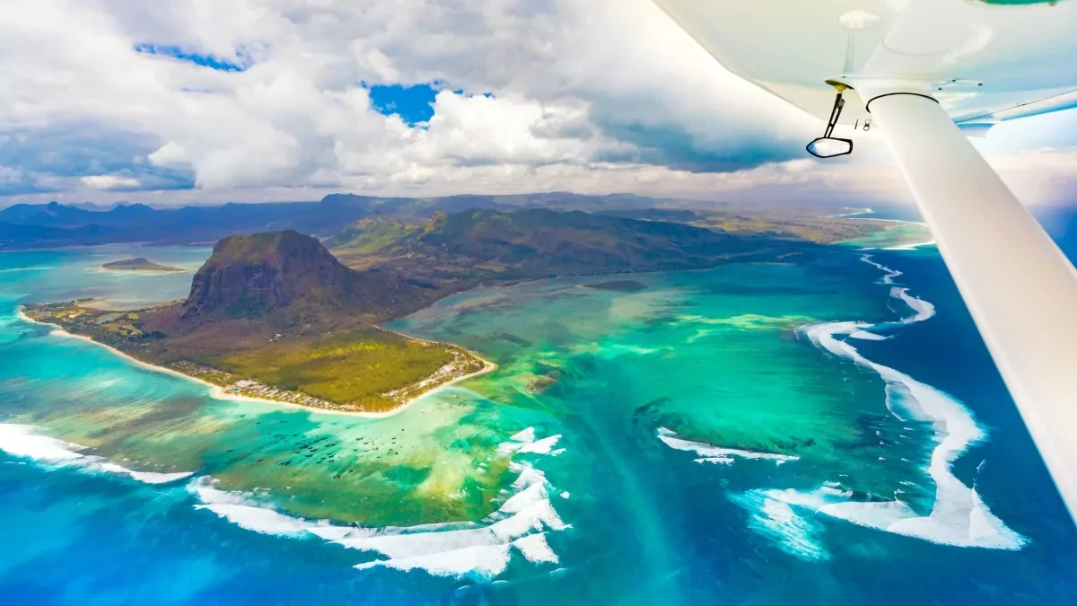 Isso porque a movimentação dos sedimentos no fundo do mar, somada às águas cristalinas da região, cria o efeito que só pode ser observado sobrevoando a região, chamada de Le Morne, e Patrimônio Mundial da Unesco.