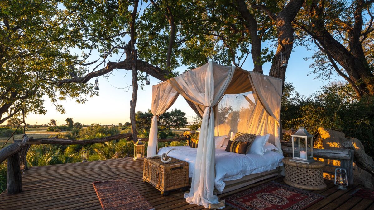 A plataforma elevada ao ar livre é um convite para abandonar as quatro paredes convencionais e se embalar pelos sons da noite até cair no sono sob as estrelas do céu do Delta do Okavango.
